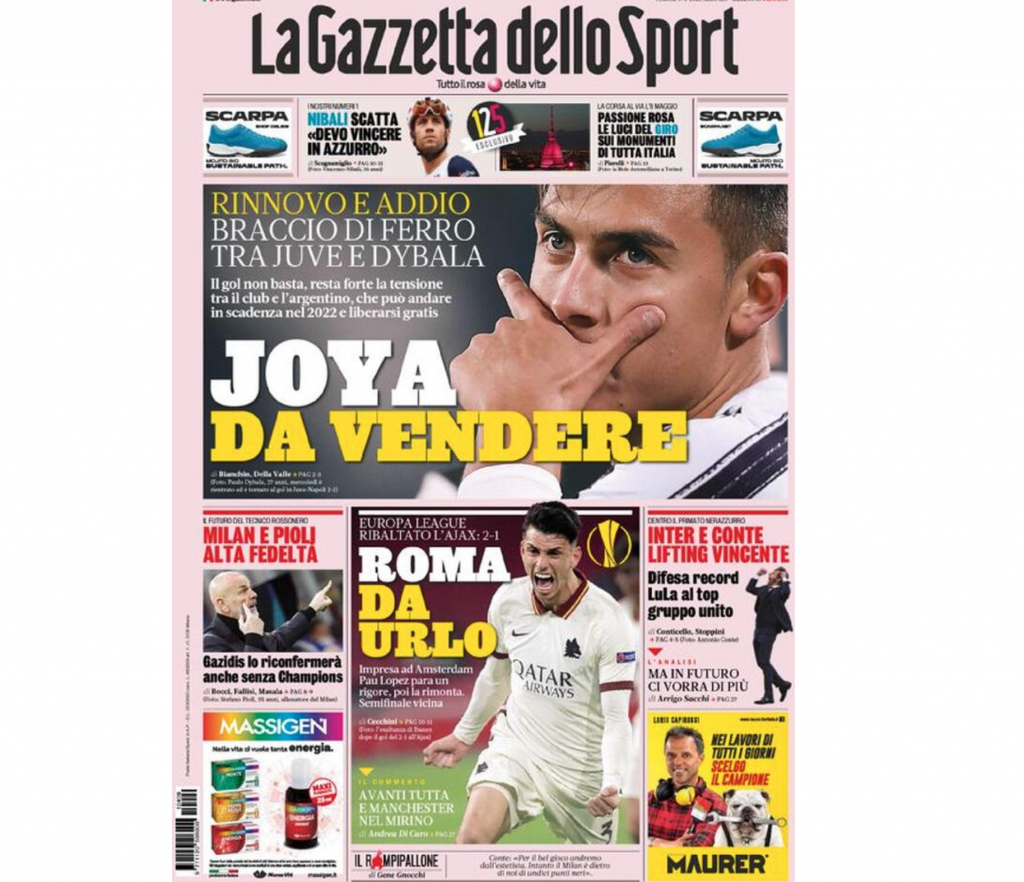 Anche la prima pagina de La Gazzetta dello Sport si concentra sul futuro di Paulo Dybala: “Joya da vendere. Rinnovo e assiomatizzerete. Braccio di ferro tra Juve e Dybala. Il gol non basta. Resta forte la tensione tra il club e l’argentino, che può andare in scadenza nel 2022 e liberarsi gratis”.