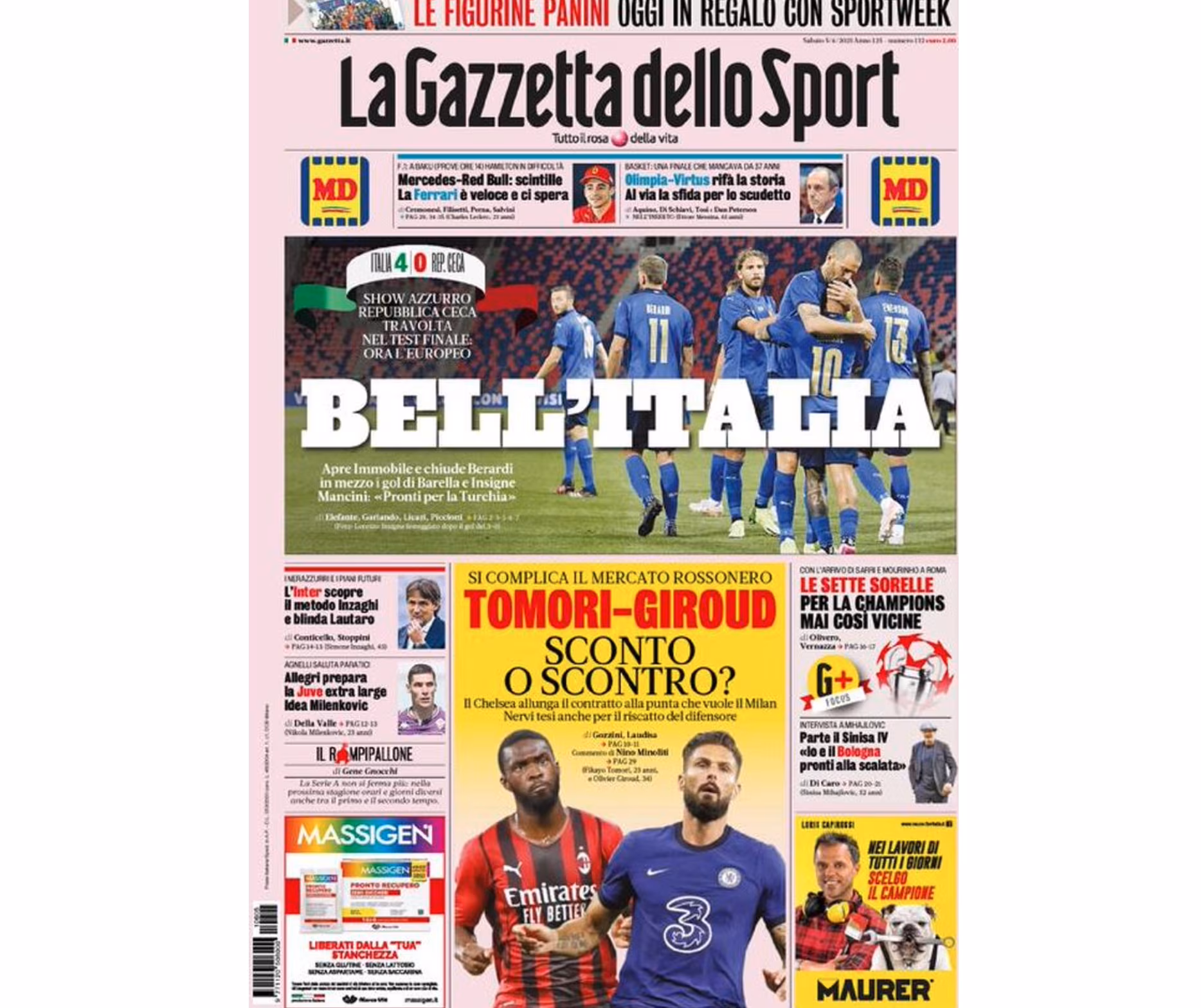 La prima pagina de La Gazzetta dello Sport in edicola oggi dedica la sua apertura alla vittoria dell’Italia: “Bell’Italia. Show azzurro, Repubblica Ceca travolta nel test finale. Ora l’Europeo”.