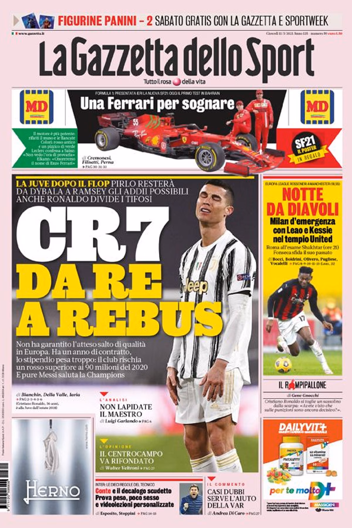La disfatta della Juventus in Champions League continua a riempire le pagine dei quotidiani sportivi. La Gazzetta dello Sport apre l’edizione odierna con un focus sul futuro dei bianconeri. “Da re a rebus” – il titolo della rosea, che mette in evidenza la questione che sta dividendo i tifosi della Signora, che per la terza volta consecutiva viene eliminata dalla Champions dopo un sorteggio apparentemente favorevole. Il proseguimento dell’avventura del portoghese a Torino è per la prima volta messa in seria discussione. Le motivazioni dell’eventuale addio, sarebbero economiche oltre che tecniche. In un momento di crisi economica come questo, l’altissimo ingaggio di CR7 potrebbe diventare un costo troppo complicato da gestire.
