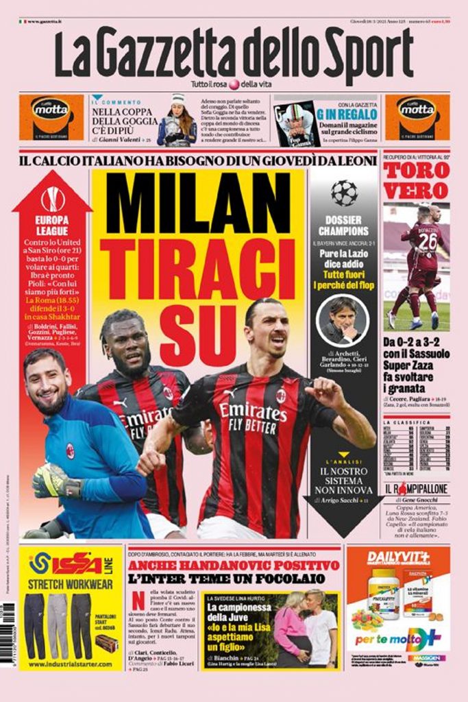 La rassegna stampa di oggi apre con la prima pagina de La Gazzetta dello Sport. La rosea apre la sua edizione odierna con un focus sul turno di Europa League, che si giocherà stasera. Le speranze delle italiane in Europa sono riposte nella Roma e nel Milan, che stasera affronterà il Manchester United nei sedicesimi. Dopo le eliminazioni di Juventus, Atalanta e Lazio dalla Champions League, il calcio italiano sarà rappresentato soltanto dalle squadre rimaste nella competizione minore. I rossoneri, forti di un risultato favorevole maturato nella gara di andata, possono anche puntare allo 0-0 per passare il turno.