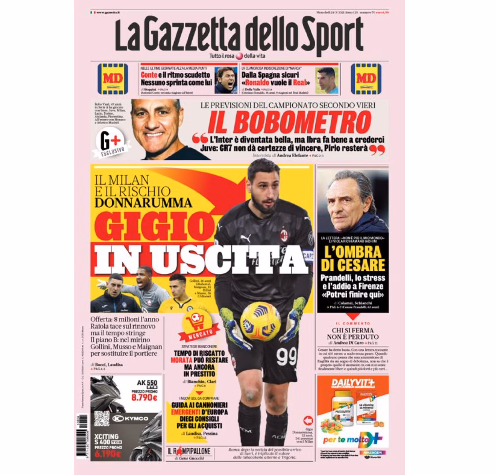 La prima pagina de La Gazzetta dello Sport dedica il taglio alto all’intervista esclusiva con l’ex attaccante Bobo Vieri: “Il Bobometro. Le previsioni del campionato secondo Vieri. L’Inter è diventata bella, ma Ibra fa bene a crederci. Juve: CR7 non dà certezze di vincere, Pirlo resterà”.