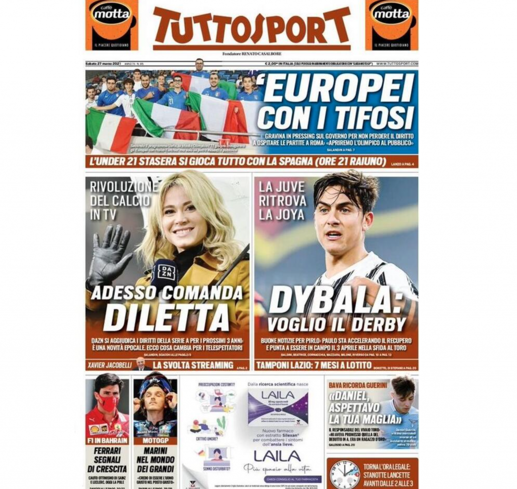 La prima pagina di Tuttosport in edicola oggi dedica il suo taglio alto alle parole di Gravina: “Europei con i tifosi”, con il presidente della FIGC che ha aperto ai tifosi negli stadi per l’inizio dell’Europeo. Sotto la Juve e il ritorno di Dybala: “Dybala: voglio il derby”.