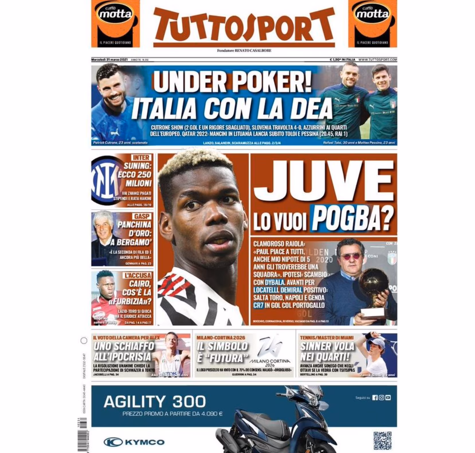 La prima pagina di Tuttosport in edicola oggi è dedicata al mercato della Juventus e al casting per il centrocampo: “Juve lo vuoi Pogba? Ipotesi scambio con Dybala. Avanti per Locatelli. Demiral positivo: salta Toro, Napoli e Genoa”.