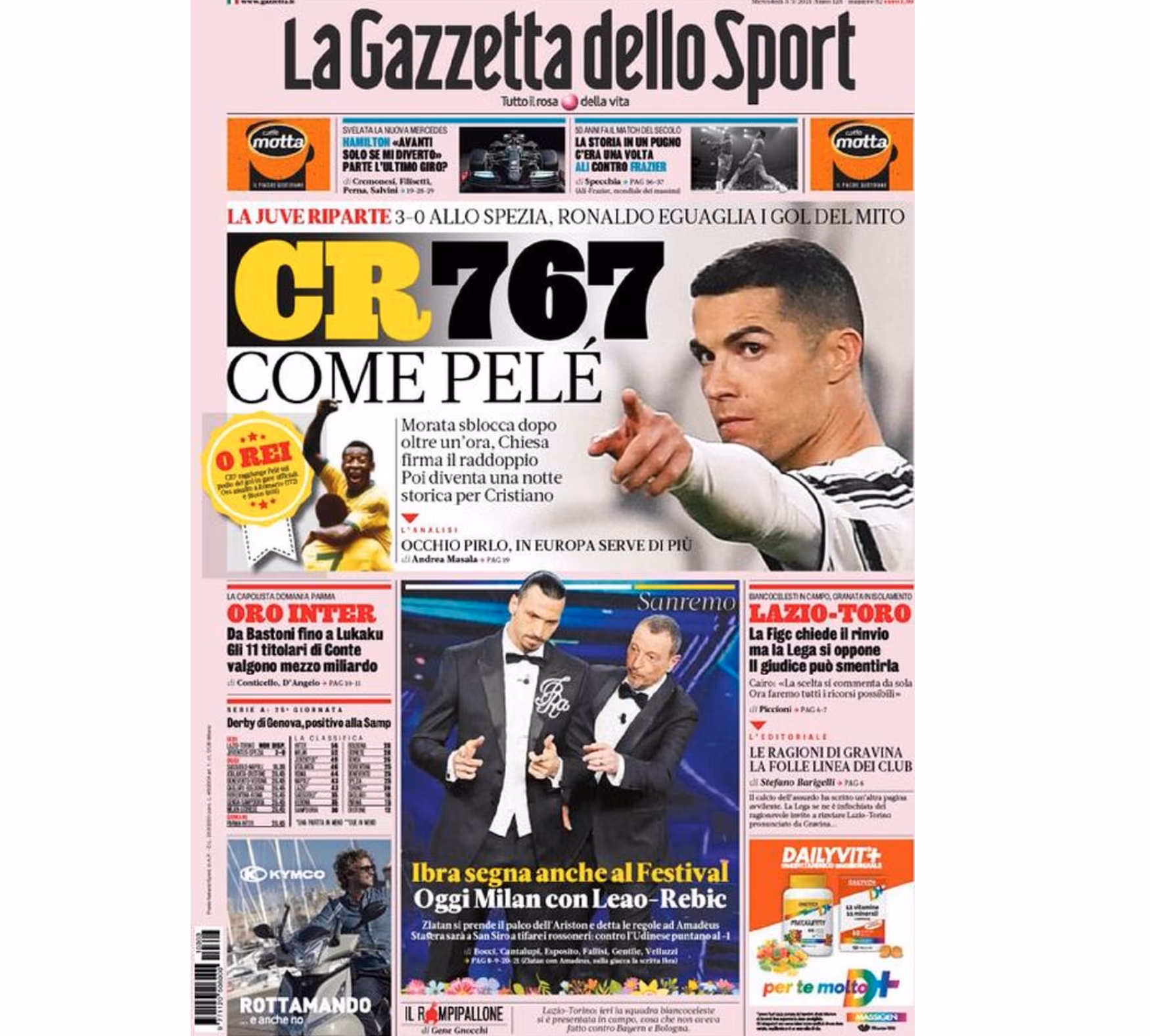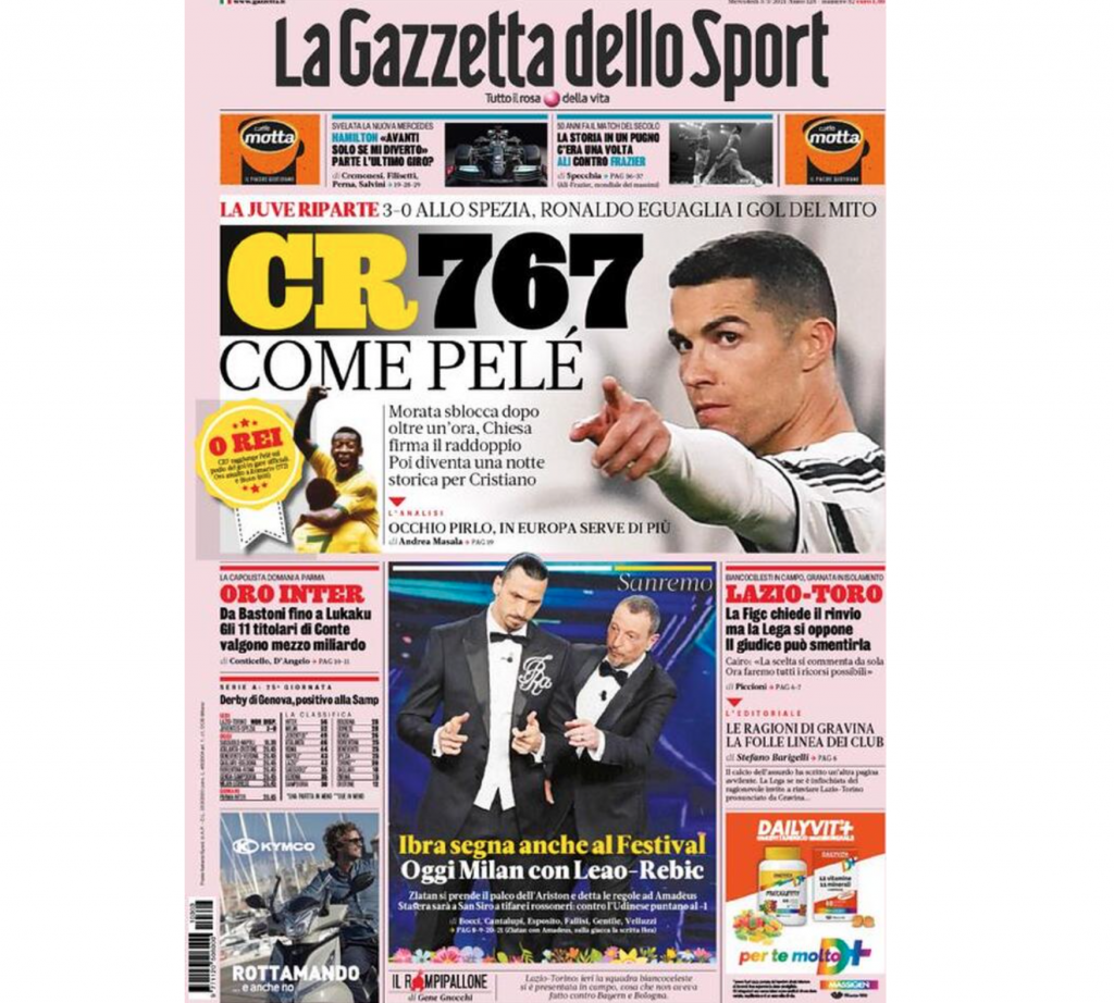 Anche Tuttosport dedica la sua prima pagina alla Juventus e alla vittoria di ieri sera: “Ronaldo o Rei Juve. Spezia travolto nella ripresa: 3-0. Decisivo l’ingresso di Morata. Lo spagnolo e Bernardeschi entrano nel secondo tempo e cambiano la partita: subito a segno Alvaro, 2-0 di Chiesa, poi il gol storico di CR7. 767 reti come Pelè.”