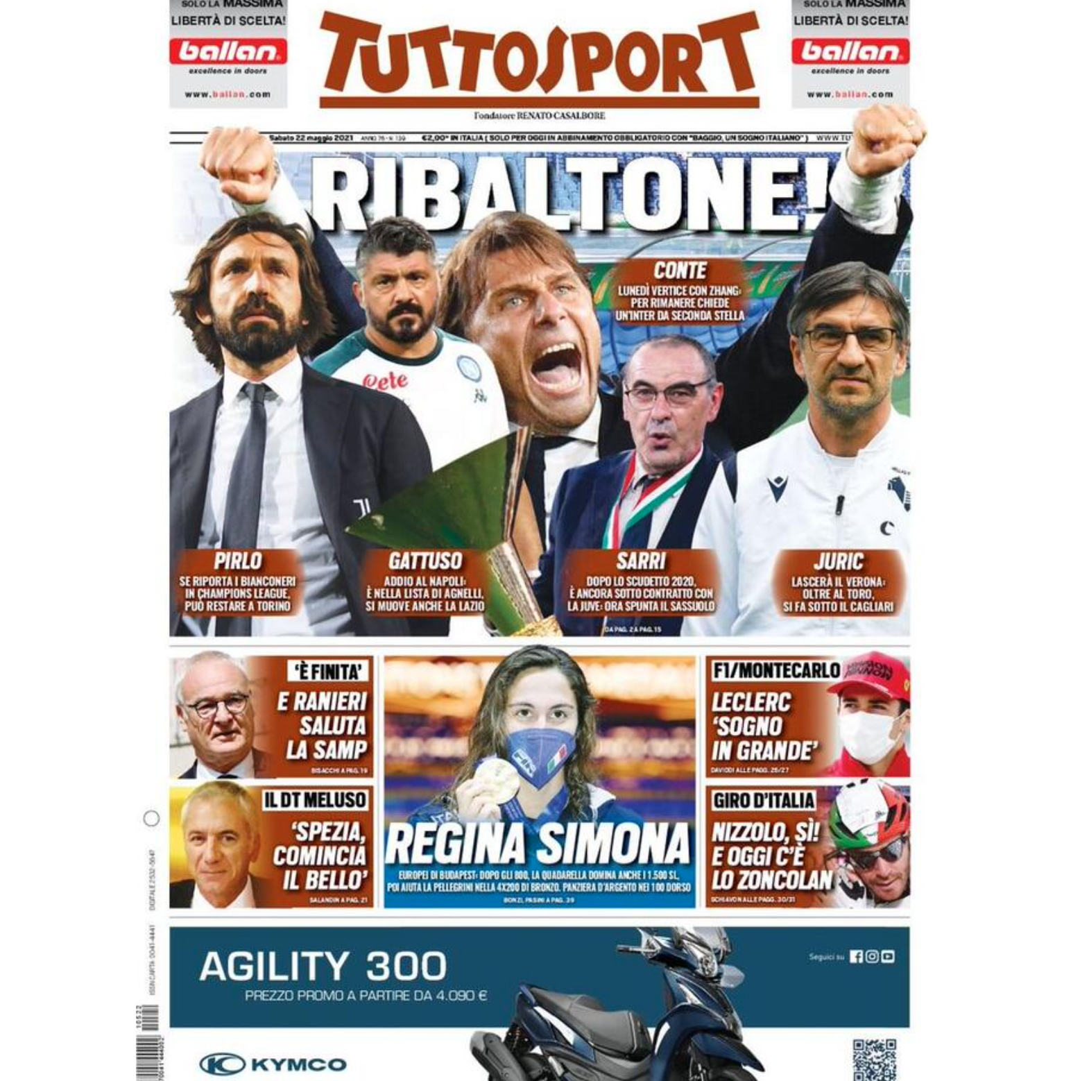 La prima pagina di Tuttosport in edicola domani dedica la sua apertura al toto allenatori: “Ribaltone! Pirlo, Gattuso, Conte, Sarri e Juric”.