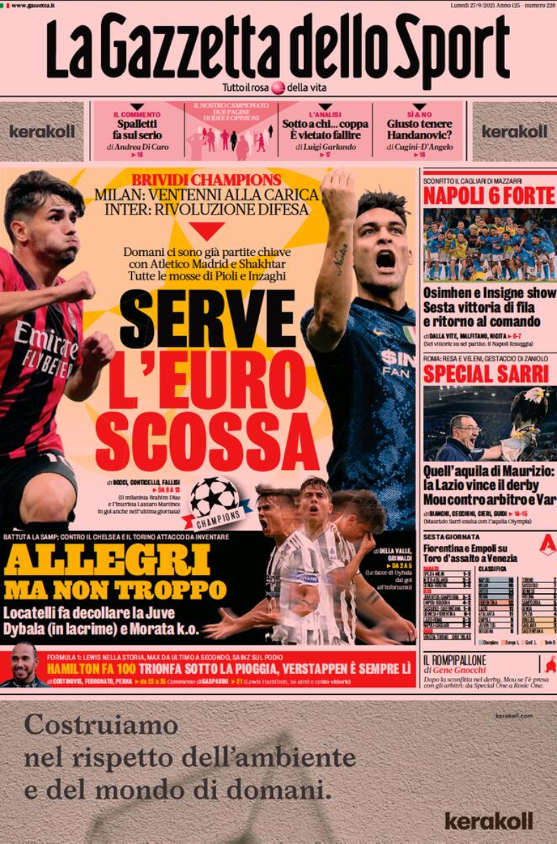 “Serve l’Euro scossa”, intitola La Gazzetta dello Sport. Terminata la giornata di Serie A, le big del campionato devono cominciare a pensare alla Champions League. Milan e Inter hanno fatto bene contro Liverpool e Real Madrid, senza però riuscire a vincere. Ora, invece, sarà necessario cominciare a portare a casa punti preziosi. In taglio basso spazio alla Juventus: “Allegri ma non troppo”. I bianconeri hanno vinto contro la Sampdoria, ma i problemi rimangono. Articoli di spalla dedicati a Napoli e Lazio, vincitrici dei rispettivi match contro Cagliari e Roma.