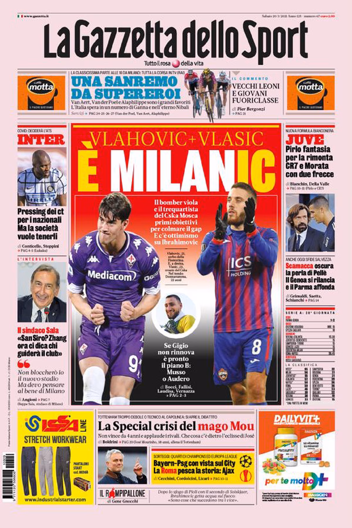 [fncvideo id=659133 autoplay=true] TORINO – La prima pagina di oggi de La Gazzetta dello Sport intitola così: “Vlahovic+Vlasic: è Milanic”. Il riferimento è ai due calciatori della Fiorentina e del CSKA Mosca che potrebbero essere dei rinforzi importanti per il prossimo anno nella rosa del tecnico Pioli. Il quotidiano riporta come ci sia anche fiducia per il rinnovo di Ibrahimovic e per la permanenza di Donnarumma. Ma se il giovane portiere dovesse essere ceduto, il rossoneri virerebbero su Audero della Sampdoria o Musso dell’Udinese. Questo invece il titolo del Corriere dello Sport: “La battaglia di Agnelli”. Il riferimento è ovviamente al presidente della Juventus che si sta occupando in prima persona per un accordo tra UEFA ed ECA sulla gestione dei diritti tv dei club in Europa. Bianconeri che affronteranno domenica il Benevento all’Allianz Stadium e l’obiettivo del tecnico Pirlo è la rimonta in campionato sull’Inter per vincere un decimo scudetto che avrebbe del clamoroso. Di seguito riportiamo la probabile formazione della squadra bianconera: Juventus (4-4-2): Szczesny; Danilo, Bonucci, de Ligt, Bernardeschi; Chiesa, Rabiot, Arthur, McKennie; Ronaldo, Morata. All. Pirlo.