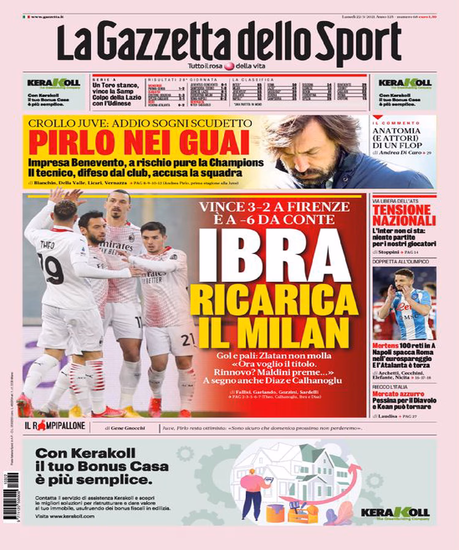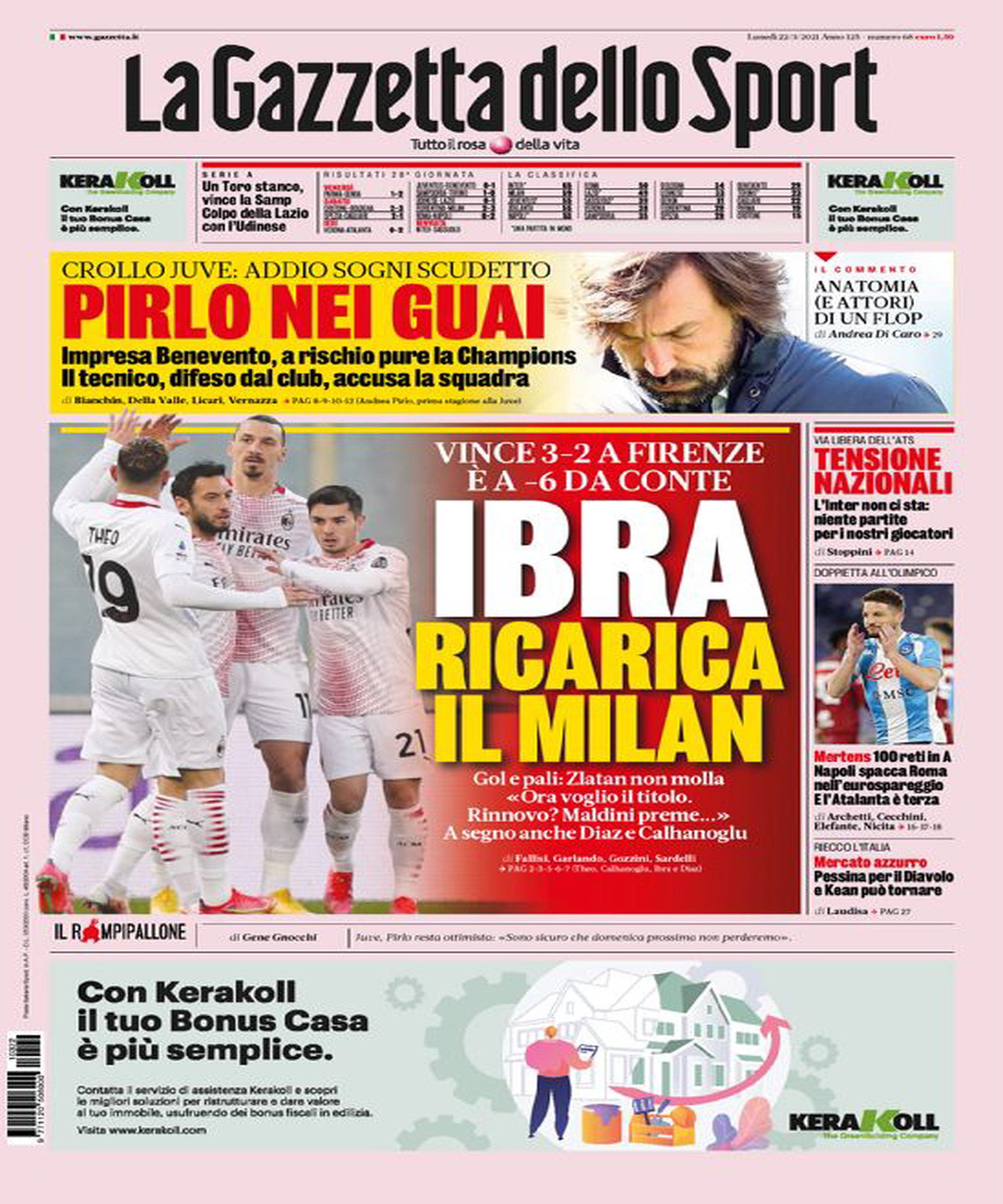 [fncvideo id=659445 autoplay=true] TORINO – La prima pagina de La Gazzetta dello Sport intitola così: “Ibra ricarica il Milan”. Il riferimento è alla vittoria dei rossoneri in trasferta contro la Fiorentina per 3-2 con gol di Ibrahimovic. La squadra di Pioli si è dunque rilanciata in chiave scudetto e Champions League. In alto, sezione dedicata alla Juventus: “Pirlo nei guai”. Il riferimento è alla clamorosa sconfitta della Juventus di ieri in casa contro il Benevento che non ha di certo reso contento Andrea Pirlo, tecnico bianconero: “Avevamo il dovere di fare una partita migliore, mentre purtroppo abbiamo giocato una brutta gara sotto tutti gli aspetti. Siamo incappati in una giornata storta, nell’atteggiamento, nelle situazioni tecniche… Sapevamo che sarebbe stata difficile perché il Benevento è una squadra organizzata che si difende molto bene con due linee compatte, quindi bisognava avere anche la calma di sfruttare meglio l’ampiezza del gioco, invece abbiamo sbagliato molto.