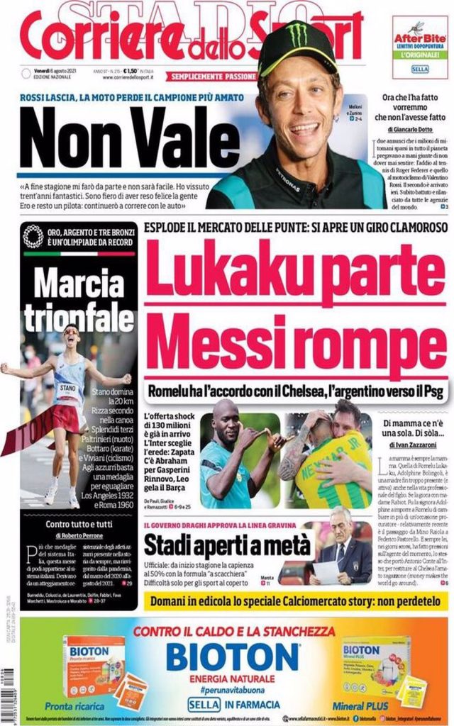 A fronte di questa situazione, Leo Messi non resterà legato al Barcellona e le due parti esprimono il loro fortissimo rammarico per essere riusciti ad esaudire i rispettivi desideri. Il Barcellona vuole ringraziare con tutto il cuore il giocatore per l’apporto che ha dato e manifestargli l’apprezzamento del club, augurandogli il meglio per il suo futuro”. Questa invece la prima del Corriere dello Sport: “Lukaku parte, Messi rompe”. Il riferimento è ormai alla quasi cessione dell’attaccante belga al Chelsea. La punta nerazzurra dovrebbe passare ai blues per una cifra intorno ai 120 milioni di euro, anche se, ad oggi, l’unica offerta recapitata dall’Inter è quella di 100 milioni di euro più il cartellino di Marcos Alonso.