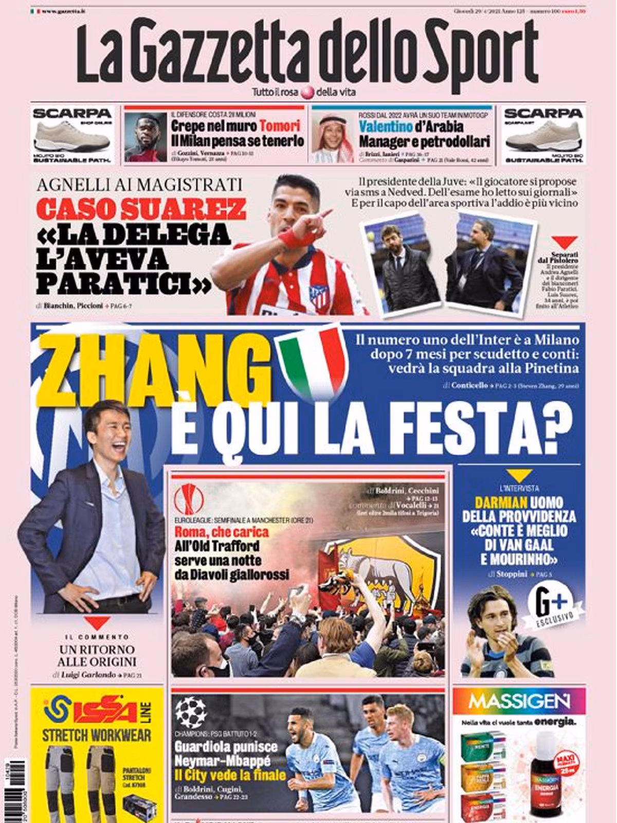 La rassegna stampa di oggi si apre con la prima pagina de La Gazzetta dello Sport, ampiamente dedicata all’imminente festa scudetto dei nerazzurri. Il presidente Zhang sarebbe rientrato a Milano per festeggiare il primo titolo e concentrarsi su diverse questioni ancora da risolvere. Spazio in apertura per il caso Suarez in seguito al trapelare della deposizione di Andrea Agnelli. Il numero uno bianconero ha dichiarato che fu l’uruguaiano a proporsi a Nedved, oltre che di non essere a conoscenza della situazione legata all’esame per la cittadinanza. “La delega l’aveva Paratici” – avrebbe dedicato il presidente della Juventus, scaricando quindi ogni eventuale responsabilità sul CFO. La posizione di Paratici, il cui futuro in bianconero sembrerebbe essere tutt’altro che certo, a questo punto si fa più complessa.