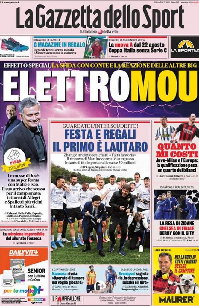 Protagonista indiscusso delle prime pagine degli ultimi giorni, Josè Mourinho monopolizza anche la rassegna stampa di oggi. L’edizione odierna de La Gazzetta dello Sport dedica grande spazio al ritorno in Italia del tecnico portoghese. “ElettroMou” – titola la rosea, ponendo l’attenzione sugli effetti che la firma di Mourinho con la Roma porterà sul resto del calcio italiano. Per quanto riguarda la Juventus, la risposta della dirigenza bianconera potrebbe configurarsi in un ritorno di Massimiliano Allegri. La conferma di Pirlo appare tutt’altro che scontata, mentre l’ombra di Max incombe sul tecnico esordiente.
