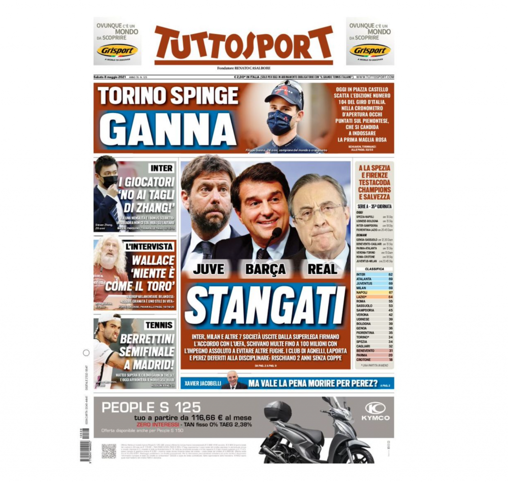 La prima pagina di Tuttosport in edicola oggi dedica la sua apertura alla questione Superlega: “Juve, Barça, Real. Stangati. Inter, Milan e altre sette società uscite dalla Superlega firmano l’accordo con la UEFA”.