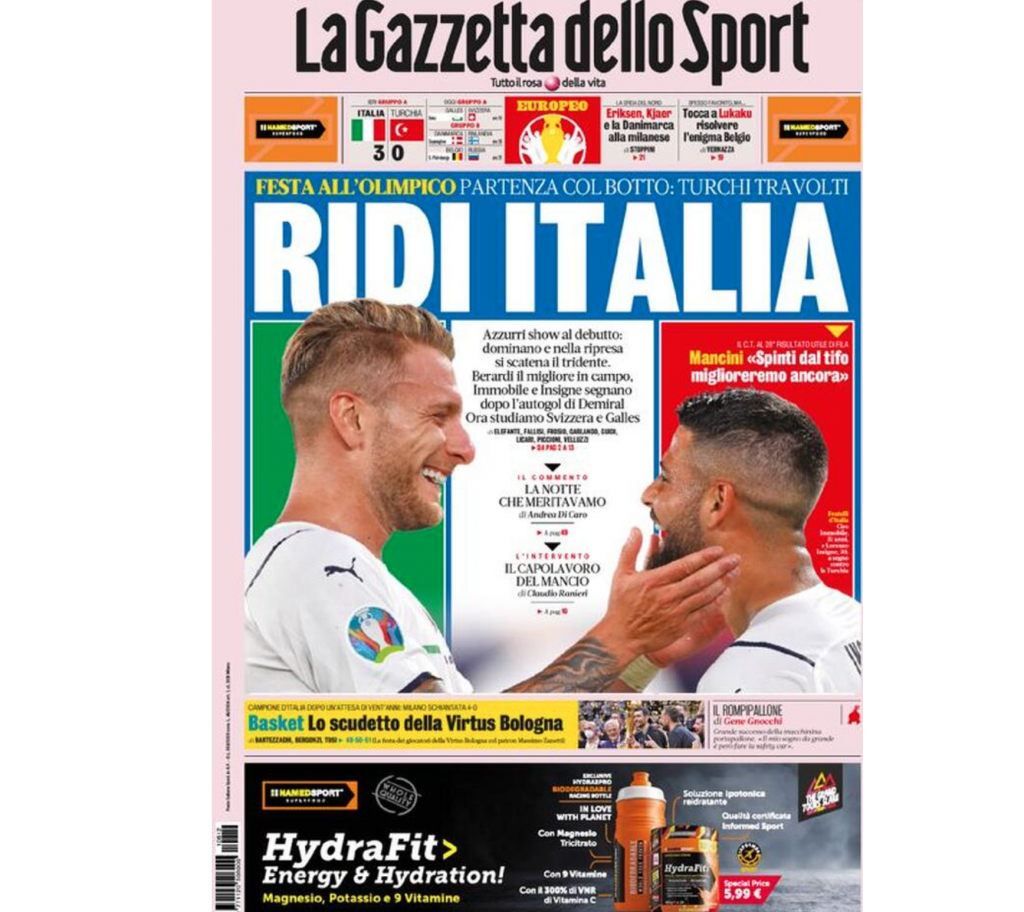 La prima pagina de Il Corriere dello Sport titola: “Viva l’Italia. Europei, gli Azzurri partono alla grande tra gli applausi dell’Olimpico. Splendido debutto, travolta la Turchia: 3-0. Mercoledì la Svizzera”.