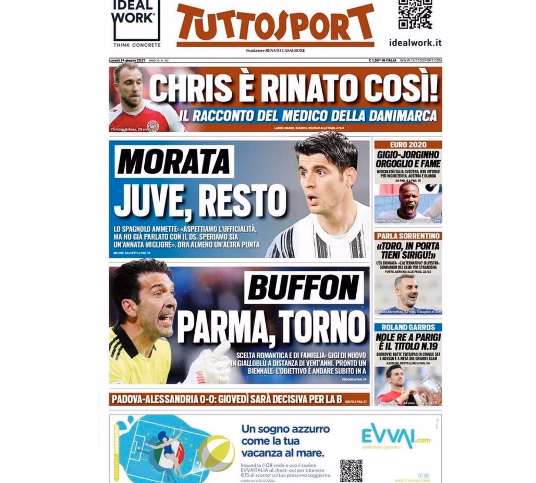 La prima pagina di Tuttosport in edicola oggi dedica la sua apertura ai destini di Morata e Buffon: “Morata: Juve, resto” e “Buffon: Parma, torno”