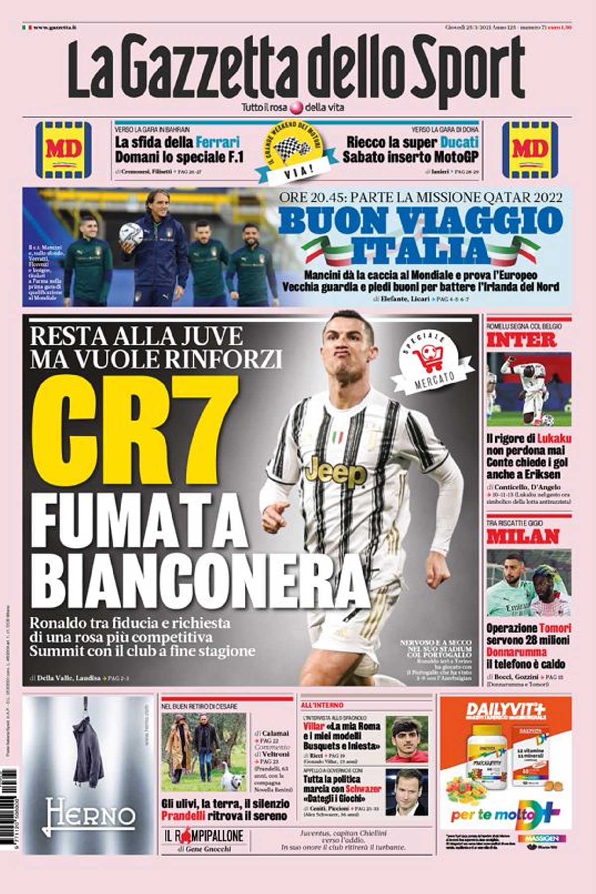Il caso Ronaldo è protagonista della rassegna stampa di oggi. Il futuro del portoghese sarà il grande tema che accompagnerà la Juventus da qui alla fine della stagione e oltre. Il presunto mal di pancia del portoghese non sembrerebbe però essere così grave. Stando all’edizione odierna de La Gazzetta dello Sport, CR7 sarebbe pronto a restare, ma avrebbe delle richieste di cui discutere con la dirigenza. “Summit con il club a fine stagione” – scrive la rosea. È noto che la Juventus abbia bisogno di rinforzi per tornare competitiva ai massimi livelli, dunque la fiducia del portoghese potrebbe far pensare a un piano ambizioso della società. Piccolo spazio in apertura anche per la prestazione di CR7 in nazionale. Nella vittoria contro L’Azerbaijan Ronaldo è rimasto a secco, ma avrà la chance di rifarsi nei prossimi due incontri con Serbia e Lussemburgo.