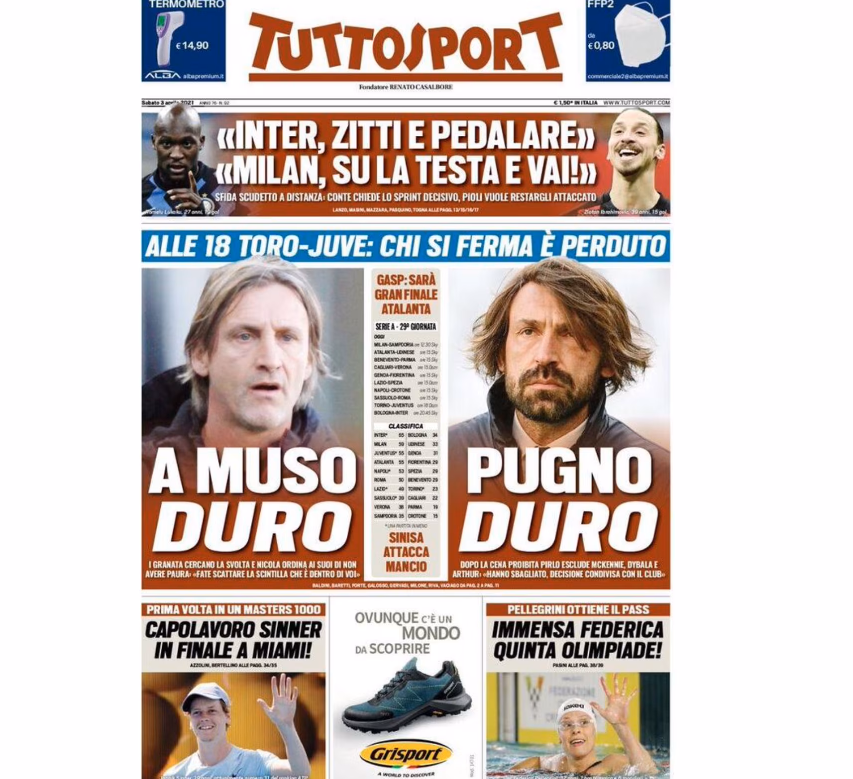 La prima pagina di Tuttosport in edicola oggi è dicecata al derby di Torino: “Alle 18 Toro-Juve: chi si ferma è perduto”. Nicola a muso duro carica per la partita, Pirlo, pugno duro con i tre giocatori coinvolti nella serata di mercoledì.