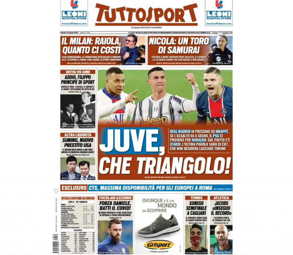 La prima pagina di Tuttosport in edicola oggi dedica la sua apertura al mercato della Juventus e degli attaccanti: “Juve, che triangolo! Real Madrid in pressione su Mbappè. Se l’assalto va a segno, il PSG ci proverà per Ronaldo. Sul piatto c’è Icardi. L’ultima parola sarà di CR7, che non desidera lasciare Torino”.