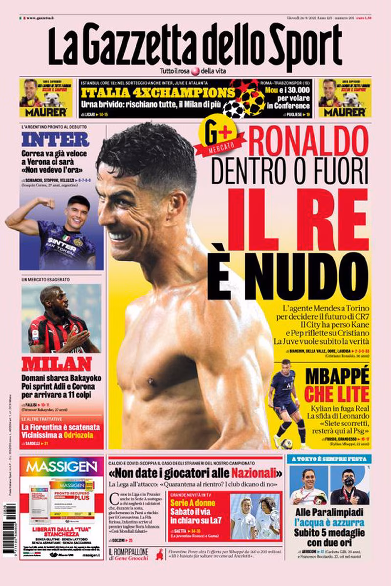 In caso di addio di Mbappé dunque il sostituto più papabile sarebbe Cristiano Ronaldo della Juve. Anche il Manchester City sarebbe sul portoghese dopo che Harry Kane ha ufficialmente detto sui propri canali social che “rimarrà sicuramente al Tottenham”. La prima pagina del Corriere dello Sport verte un po’ sugli stessi argomenti che abbiamo menzionato sopra: “215 per Mbappé, CR7 solo gratis”. Stessa cosa con la prima pagina di Tuttosport: “CR7, ecco l’offerta del City”. Oggi, intanto, la Juventus sarà impegnata nei sorteggi dei gironi di questa edizione di Champions League.