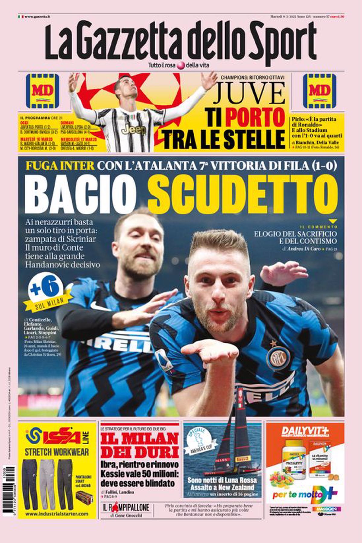 [fncvideo id=658097 autoplay=true] TORINO – “Bacio scudetto”. Questo il titolo della prima pagina de La Gazzetta dello Sport di oggi. Il riferimento è alla vittoria di ieri sera dell’Inter sull’Atalanta per 1-0 che ha permesso ai nerazzurri di fare un altro passo verso la vittoria finale dello scudetto, andando a +6 dal Milan ed a +10 dalla Juventus (che però deve recuperare il match contro il Napoli). Juventus che stasera disputerà la partita di ritorno degli ottavi di finale di Champions League contro il Porto, dopo l’andata terminata 2-1 a favore dei lusitani. Ieri, il tecnico Andrea Pirlo, ha presentato il match in conferenza stampa: “Domani è come una finale per noi e lo sarà anche per il Porto. Per ribaltare il risultato dovremo dare il massimo ed essere lucidi nel gestire la partita, giocando una gara molto tecnica, perché il Porto sarà compatto, con due linee strette e quindi ci sarà poco tempo per poter pensare.