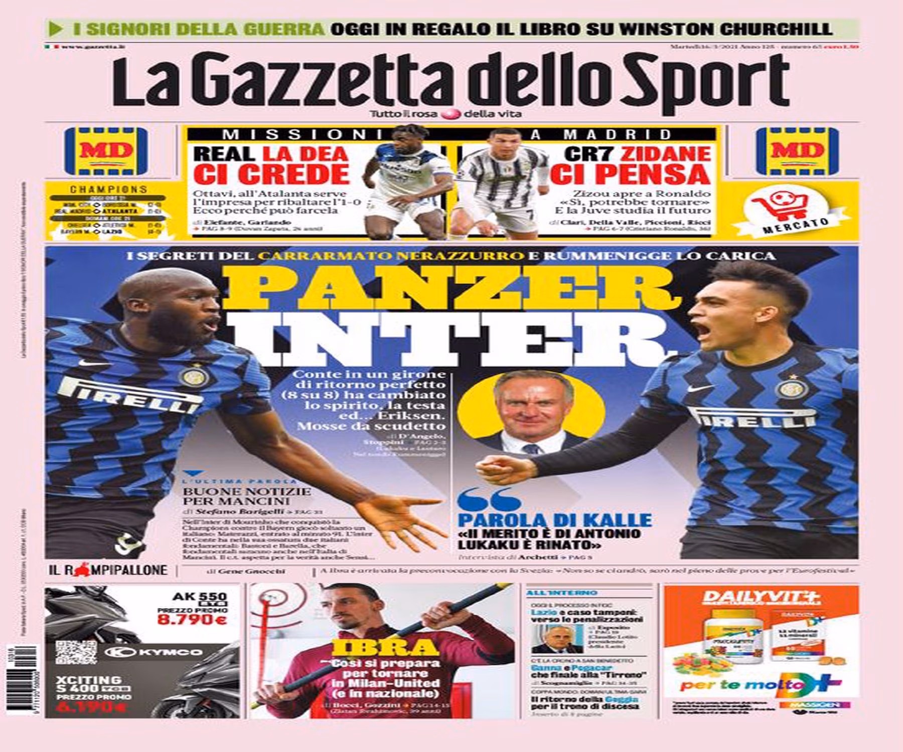 Tutto incentrato sui bianconeri, invece, il titolo della prima pagina del Corriere dello Sport: “La Juve è la vera anti-Inter”. Il riferimento è alla vittoria della squadra di Pirlo in trasferta contro il Cagliari e alla sconfitta a San Siro del Milan contro il Napoli di Gattuso che ha ristabilito le gerarchie del campionato, con ora la Juventus favorita per il secondo posto a discapito dei rossoneri. Infine titolo da clima Champions League per Tuttosport: “Dea senza paura”. Il riferimento è alla partita degli ottavi di finale di ritorno di stasera dell’Atalanta contro il Real Madrid, in cui la squadra di Gasperini cercherà di ribaltare il risultato dell’andata (1-0) e di passare un turno di Champions che avrebbe del clamoroso.
