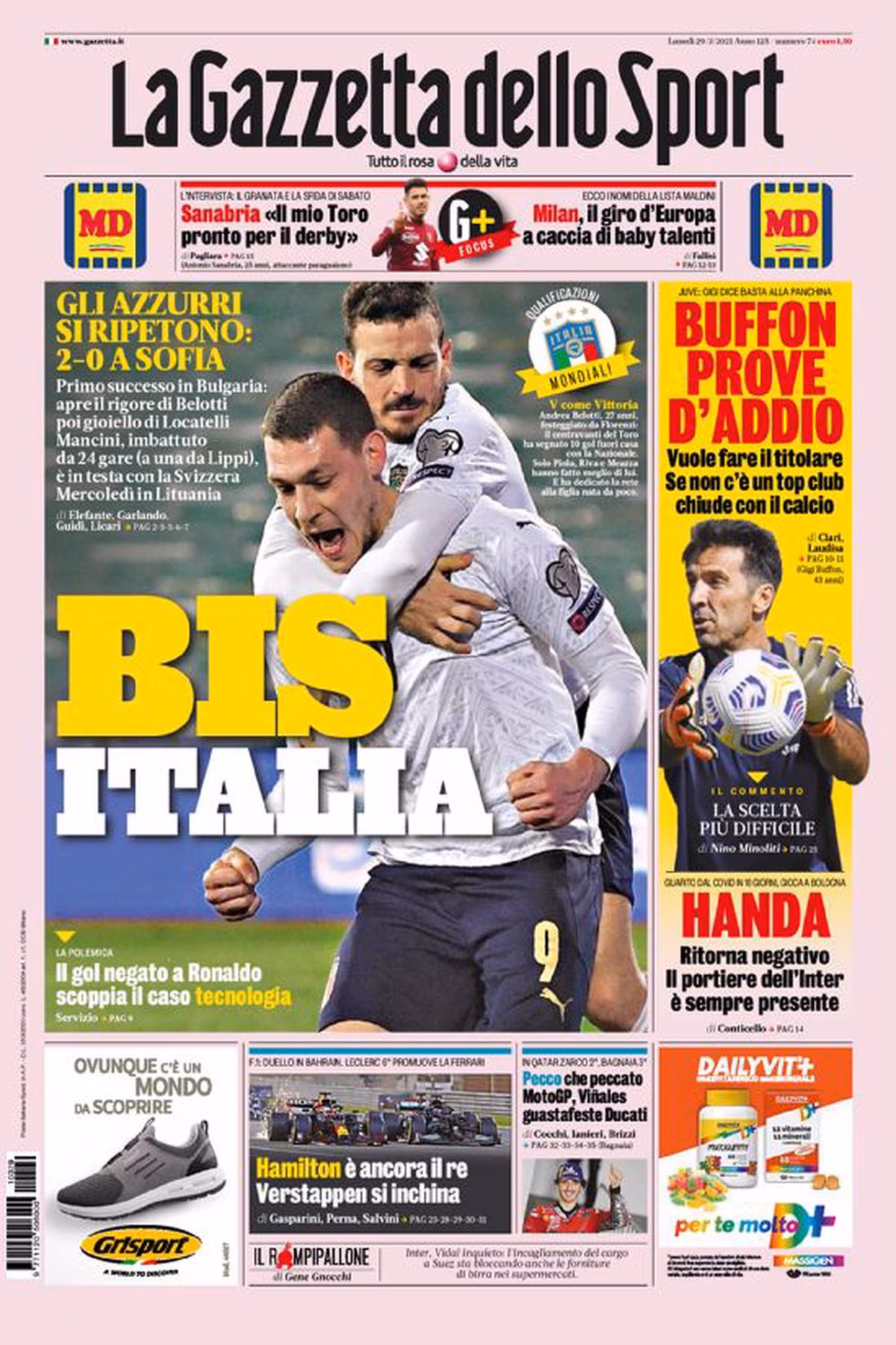 [fncvideo id=659676 autoplay=true] TORINO – La prima pagina dell’edizione odierna del quotidiano La Gazzetta dello Sport intitola così: “Bis Italia”. Il riferimento è alla seconda vittoria consecutiva dell’Italia di Roberto Mancini che ieri sera ha battuto la Bulgaria per 2-0, sfida che era valida per la qualificazione al prossimo Mondiale nel 2022 in Qatar. Di seguito riportiamo le parole del tecnico azzurro dopo il match: “Le partite sono tutte molto difficili, soprattutto quando affronti squadre che come la Bulgaria si mettono dietro la palla e giocano in contropiede. Fino al momento in cui non la sblocchi, è complicato. Siamo in un momento della stagione in cui i giocatori sono stanchi ma nel primo tempo non abbiamo praticamente mai rischiato. Non esistono poi partite facili, quando si trovano difficoltà è perché le altre squadre tendono a difendersi. Locatelli? Aveva giocato bene anche a Parma, come tutti. Magari nel secondo tempo giovedì abbiamo provato a gestirla molto. Oggi abbiamo fatto il secondo gol e non ci siamo accontentati”.