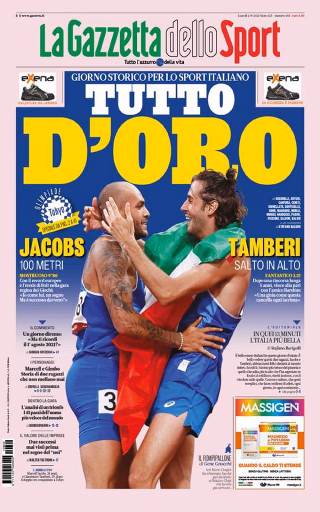 Il regolamento del salto in alto, infatti, prevede o di fare uno spareggio oppure di condividere la medaglia d’oro. Gli atleti dopo un breve consulto hanno optato per la seconda opzione, con Tamberi in estasi. Una impresa ancora più clamorosa invece quella di Marcell Jacobs ai 100 metri piani maschili. Tutti i titoli dei quotidiani sportivi di oggi si incentrano su questo fatto. Questo il titolo del Corriere dello Sport: “L’oro”. Questo invece il titolo del quotidiano Tuttosport: “La storia siamo noi”. Molti giornalisti, infatti, li hanno definiti “i 10 minuti più pazzi e più importanti della storia dello sport italiano. Subito dopo l’oro di Tamberi, Jacobs ha vinto i 100 metri piani con una super prestazione.