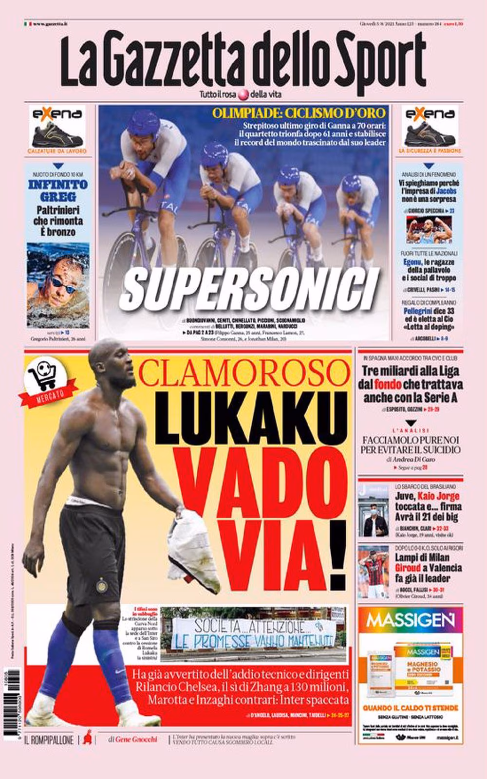 Sempre sulla stessa linea la prima pagina del Corriere dello Sport: “Voglio il Chelsea”. Tutta dedicata alle Olimpadi, invece, la prima pagina del quotidiano Tuttosport: “Fenomenali”. Il riferimento è all’oro vinto dall’Italia nella giornata di ieri dal ciclismo azzurro su pista che ha battuto in finale la Danimarca, con uno spaziale Filippo Ganna. La squadra italiana ha anche registrato il record del mondo.