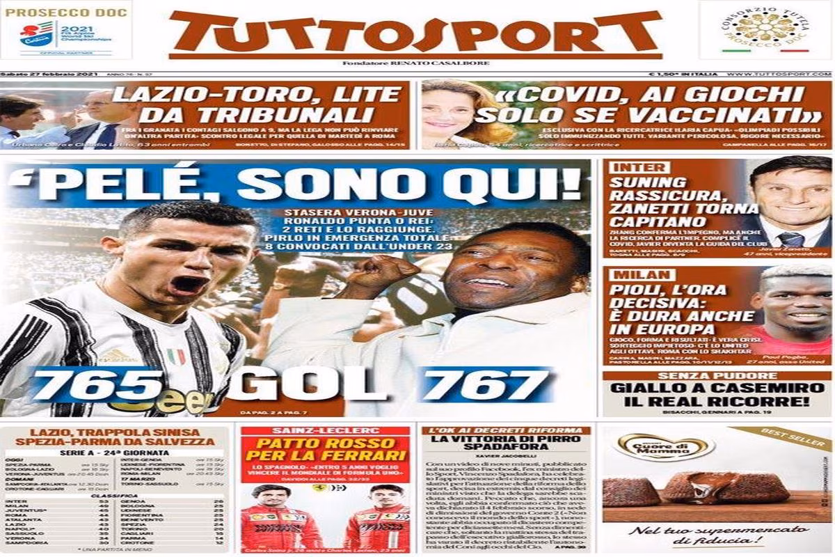 Incentrata sulla sfida di oggi della Juventus, invece, la prima pagina del quotidiano Tuttosport: “Pelé, sono qui”. Il riferimento è alla partita di stasera tra Hellas Verona e bianconeri in cui Cristiano Ronaldo potrebbe raggiungere gli stessi gol di Pelé (fermo a 767) con una doppietta. Non sarà facile però. La squadra di Andrea Pirlo si trova infatti in emergenza totale e dovrà usare, per far numero in panchina e in campo, tantissimi giovani della rosa dell’under 23, come detto dal tecnico in conferenza stampa: “Degli infortunati non recupero nessuno, l’unico che ritorna a disposizione è Rabiot che ha scontato la squalifica e ci permetterà di avere un centrocampista in più da ruotare in mezzo al campo”. Questa invece la prima pagina di QS: “Milan, coppa da veri diavoli”. Il riferimento è al sorteggio dei rossoneri di Europa League contro il Manchester United che il club ritrova dopo il trionfo del lontano 2003.
