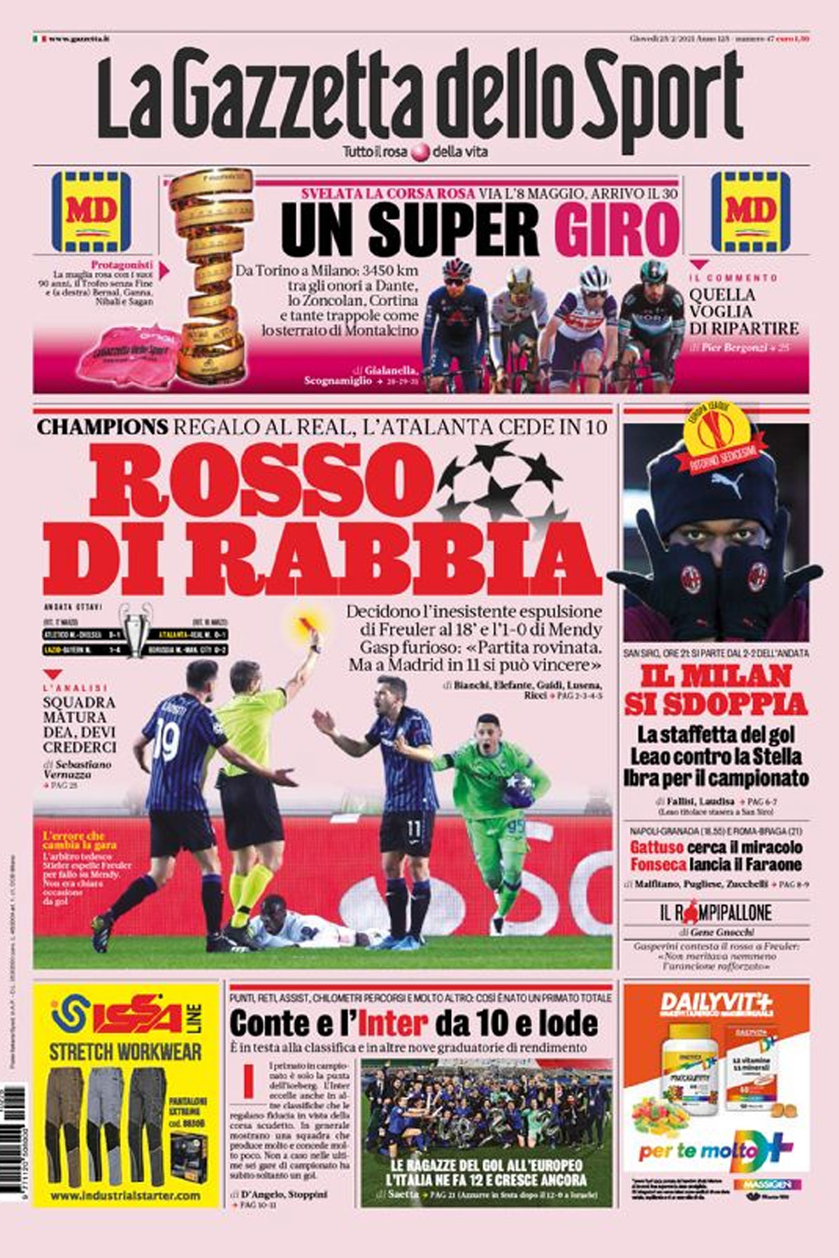 Spazio poi alla sconfitta dell’Atalanta in Champions League, la terza per le tre squadre italiane ancora impegnate nella competizione. Dopo i k.o. dell’andata di Juve e Lazio, anche la Dea ha perso nei primi 90′ degli ottavi di finale. Il quotidiano porge particolare attenzione ai tanti episodi arbitrali dubbi che hanno creato problemi alle italiane in Europa. Sia Juventus che Lazio rivendicano un rigore nelle loro prime uscite, mentre l’Atalanta si è vista cambiare radicalmente la partita per un’espulsione decisamente discutibile. Non manca anche il commento furioso di Gasperini, che non ha mancato di esternare il suo disappunto nel post partita.