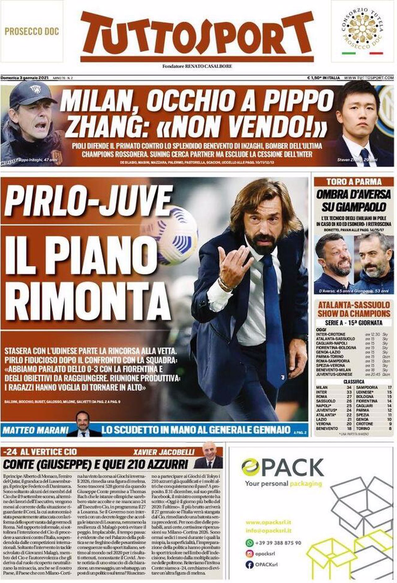 Ecco la prima pagina di TuttoSport. Il titolo principale del quotidiano torinese è dedicato proprio alla Vecchia Signora, impegnata questa sera alle 20:45 in casa contro l’Udinese. “Pirlo-Juve, il piano rimonta. Stasera con l’Udinese parte la rincorsa alla vetta. Pirlo fiducioso dopo il confronto con la squadra: ‘Abbiamo parlato dello 0-3 con la Fiorentina e degli obiettivi da raggiungere. Riunione produttiva: i ragazzi hanno voglia di tornare in alto’“. Il titolo in taglio alto, invece, è dedicato alle milanesi, le due avversarie della Juve nella lotta al titolo. “Milan, occhio a Pippo. Zhang: ‘Non vendo!’. Pioli difende il primato contro lo splendido Benevento di Inzaghi, bomber dell’ultima Champions rossonera. Suning cerca partner, ma esclude la cessione dell’Inter“.