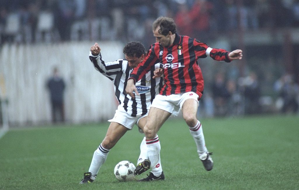 PAOLO ROSSI Un’azione di Paolo Rossi in Milan-Juventus del 1983-84. I bianconeri vincono 3-0, Pablito realizza un gol. Ne segnerà un altro anche l’anno successivo, per poi passare la stagione dopo sul fronte rossonero. ROBERTO BAGGIO E SERGIO PORRINI Un altro Milan-Juventus molto celebre è quello del 1994-95, con i bianconeri che a San Siro dominano, vincono 2-0 e si avviano sulla strada dello scudetto. Nella squadra giocano Roberto Baggio, destinato a passare proprio al Milan alla fine di questa stagione, e Sergio Porrini, cresciuto nel settore giovanile rossonero senza però riuscire a debuttare in prima squadra”.