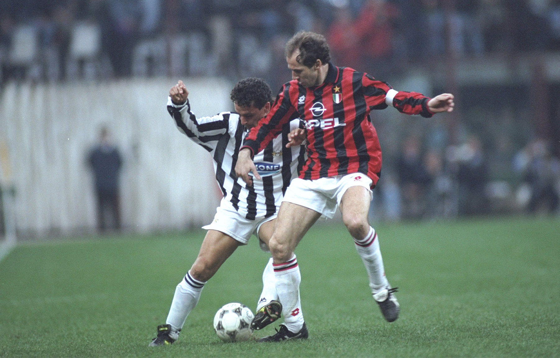 PAOLO ROSSI Un’azione di Paolo Rossi in Milan-Juventus del 1983-84. I bianconeri vincono 3-0, Pablito realizza un gol. Ne segnerà un altro anche l’anno successivo, per poi passare la stagione dopo sul fronte rossonero. ROBERTO BAGGIO E SERGIO PORRINI Un altro Milan-Juventus molto celebre è quello del 1994-95, con i bianconeri che a San Siro dominano, vincono 2-0 e si avviano sulla strada dello scudetto. Nella squadra giocano Roberto Baggio, destinato a passare proprio al Milan alla fine di questa stagione, e Sergio Porrini, cresciuto nel settore giovanile rossonero senza però riuscire a debuttare in prima squadra”.