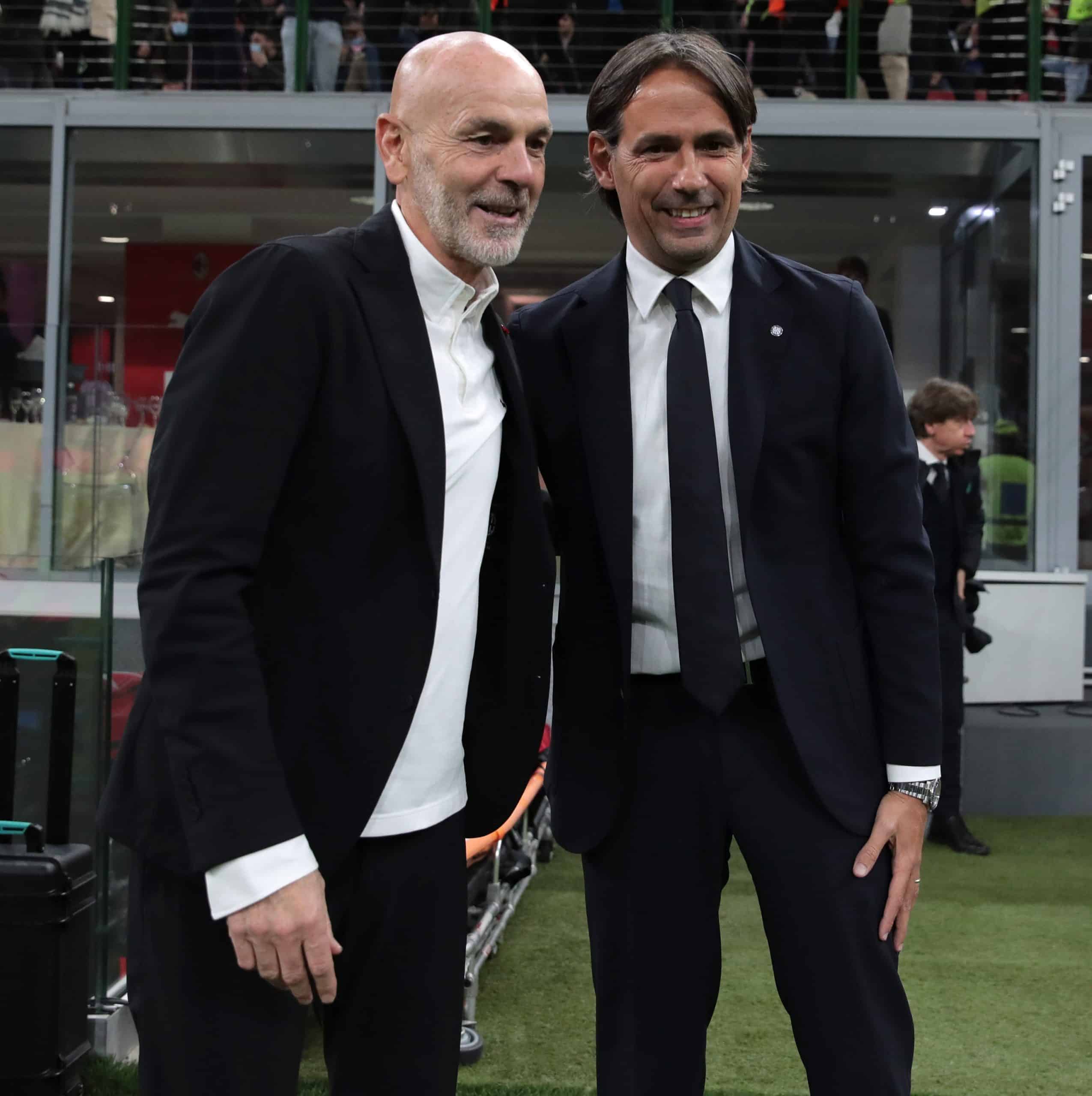 MILAN, ITALY - NOVEMBER 07: (L-R) head coach of AC Milan Stefano Pioli and head coach of FC Internazionale Simone Inzaghi before the Serie A match between AC Milan and FC Internazionale at Stadio Giuseppe Meazza on November 07, 2021 in Milan, Italy. (Photo by Emilio Andreoli - Inter/Inter via Getty Images)