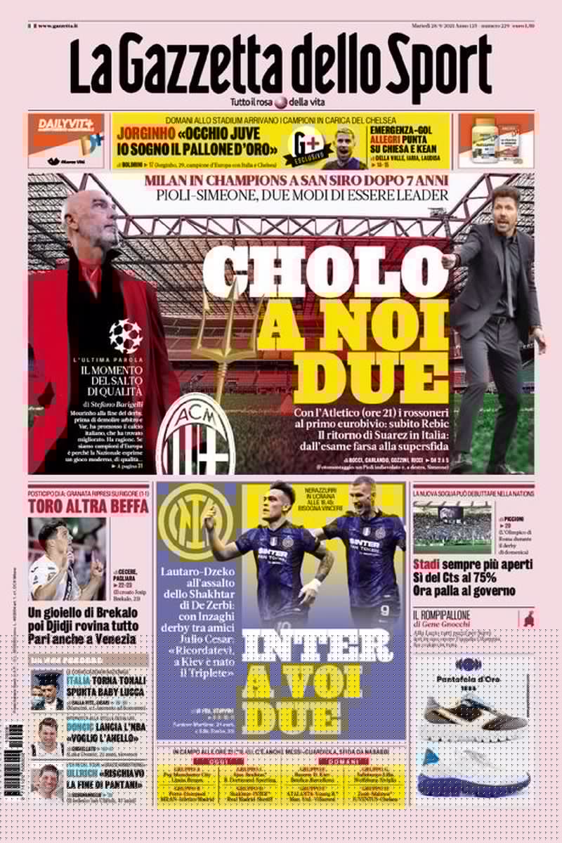 “Cholo a noi due”. Questo il titolo de La Gazzetta dello Sport di oggi. Il riferimento è al match di Champions League di stasera tra Milan e Atletico Madrid valido per la seconda giornata dei gironi di Champions League. I rossoneri, come detto dal quotidiano, torneranno a giocare in Champions League a San Siro dopo 7 anni e cercheranno sicuramente di trovare la vittoria. Ritorno in Italia anche per Suarez, dopo il famoso esame-farsa a Perugia per cercare di essere tesserato in tempo con la Juventus. Stasera scenderà in campo anche l’Inter con lo Shakhtar di mister De Zerbi.