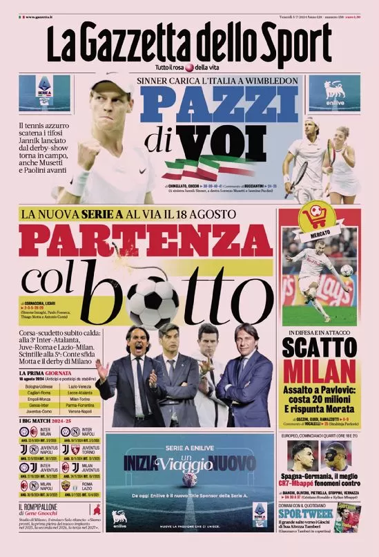 In primo piano per la rosea c’è il calendario della Serie A 2024/25 che propone sin dai primi incontri dei duelli interessanti. Uno di questi riguarda la Juventus che alla terza giornata di campionato ospiterà la Roma all’Allianz Stadium. Invece, alla quinta è il turno del Napoli dell’ex bianconero Antonio Conte, anch’egli ospitato tra le proprie mura amiche.