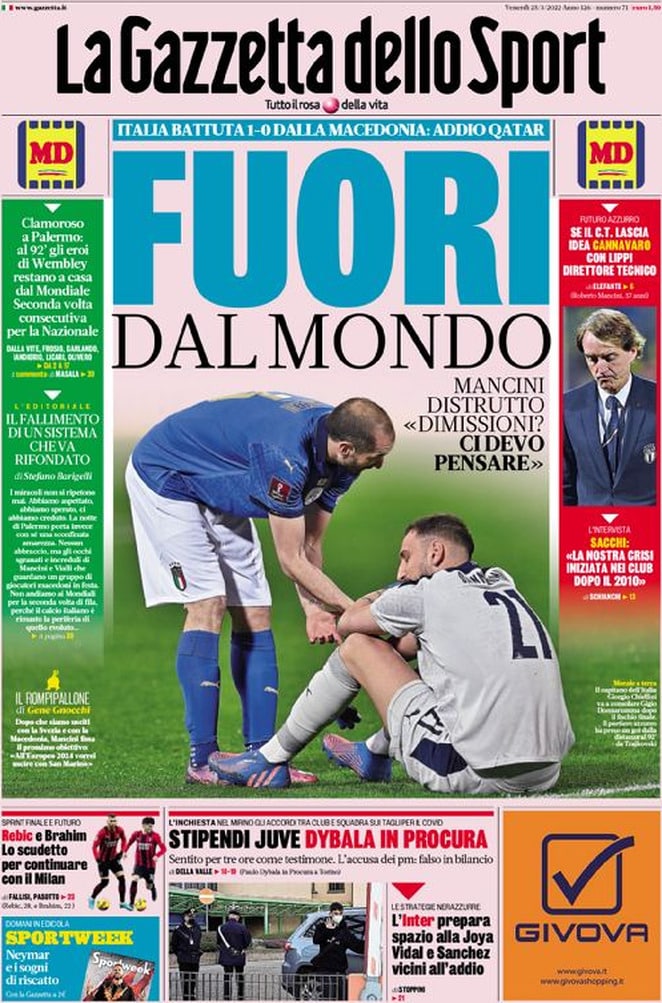 La Gazzetta dello Sport titola con “Fuori dal Mondo”, un riferimento chiaro e preciso per l’Italia, che soltanto sei mesi fa ci faceva gioire con la vittoria dell’Europeo a Wembley. Un’involuzione difficile da spiegare, ma adesso è tempo di capire gli errori e intervenire dove possibile.