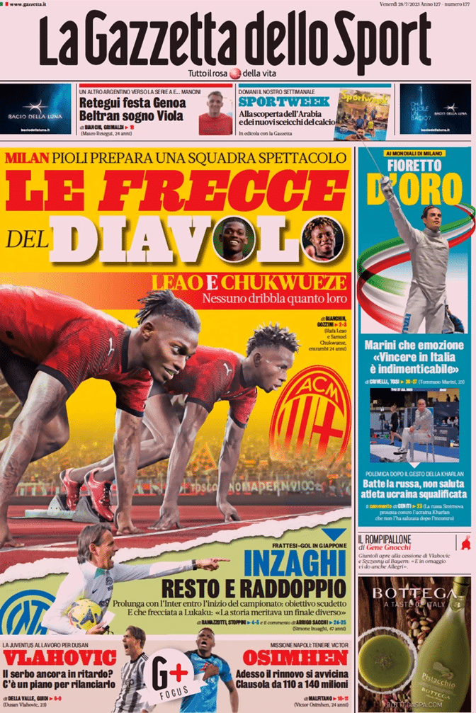 La Gazzetta dello Sport apre in prima pagina con il titolo: “Le frecce del Diavolo” in relazione al mercato del Milan. Sulla Juve tiene banco la questione legata alle condizioni di Dusan: “A lavoro per Vlahovic. Il serbo ancora in ritardo? C’è un piano per rilanciarlo.”