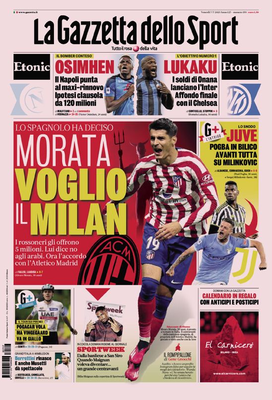 Oggi è venerdì 7 luglio 2023 e la redazione di Juvenews.eu vi augura una buonissima giornata. La priorità numero uno per la Juve al momento è vendere ancor prima di comprare. Quasi nessuno al momento è ritenuto incedibile e la società punta a fare cassa. Servono sacrifici e la Juventus è disposta a rinunciare anche ai suoi gioielli più preziosi. Zakaria, Mckennie e Arthur, restano in cima alla lista degli esuberi e al di fuori del progetto bianconero. La Juve punta tutto su di loro per iniziare a fare qualche manovra in entrata: in primis i bianconeri tengono d’occhio Sergej Milinkovic-Savic. Andiamo alla scoperta dei titoli delle prime pagine dei principali quotidiani sportivi.