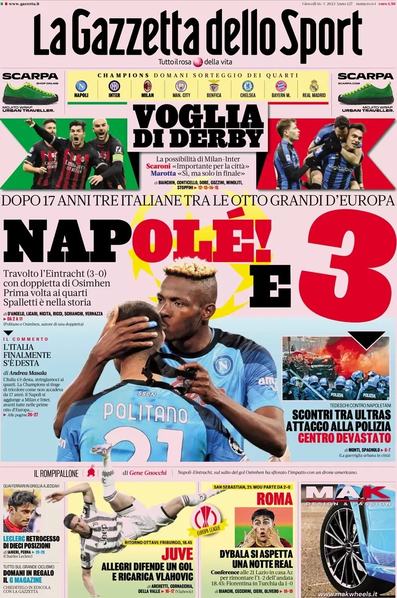 Napoli, Inter e Milan, infatti, sono tutte riuscite a qualificarsi ai quarti di finale dove affronteranno una tra Real Madrid, Bayern Monaco, Manchester City, Chelsea e Benfica.