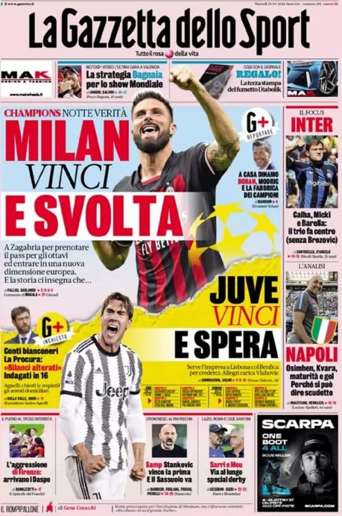“Juve, vinci e spera”, questo è il titolo in prima pagina de La Gazzetta dello Sport di oggi. Questa sera i bianconeri dovranno battere il Benfica, obiettivo tutt’altro che facile, e poi sperare.