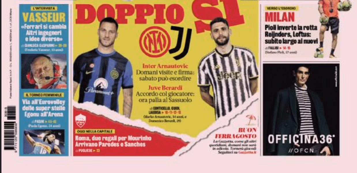 La prima pagina di Tuttosport si concentra sul mercato della Juventus, e sui fronti ancora aperti per i bianconeri. “A due settimane dalla fine del mercato la Juve ha molti fronti aperti. Lo scambio Lukaku-Vlahovic è ancora fermo, ma occhio a Berardi, Thuram e Diarra”.