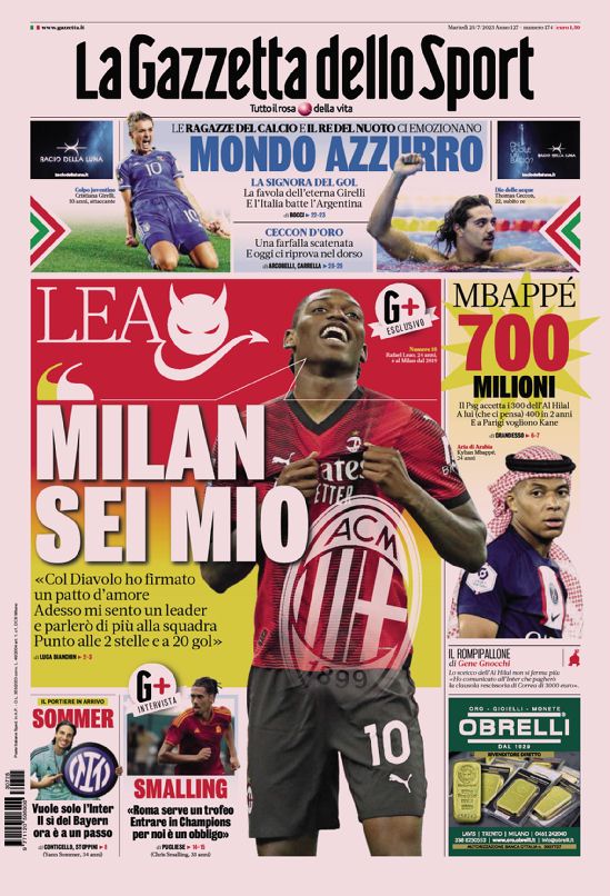 La Gazzetta dello Sport apre in prima pagina con l’offerta monstre a Mbappé: “700 milioni: il Psg accetta i 300 dell’Al-Hilal. A lui (che i pensa) 400 in 2 anni. E a Parigi vogliono Kane.”