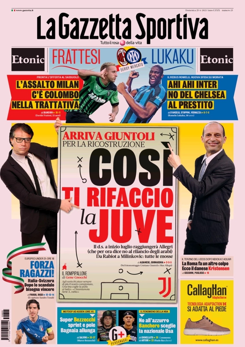 La Gazzetta dello Sport apre in prima pagina con i bianconeri, e in particolare con Cristiano Giuntoli: “Così ti rifaccio la Juve”. Secondo la Rosea il direttore sportivo del Napoli sarebbe ormai vicino a trovare l’accordo con De Laurentiis. Il ds dovrebbe quindi raggiungere Torino a inizio luglio, dove si incontrerà con Allegri. Il tecnico italiano ha ricevuto nuove offerte dall’Arabia ma è convinto di voler rimanere alla guida della Vecchia Signora.