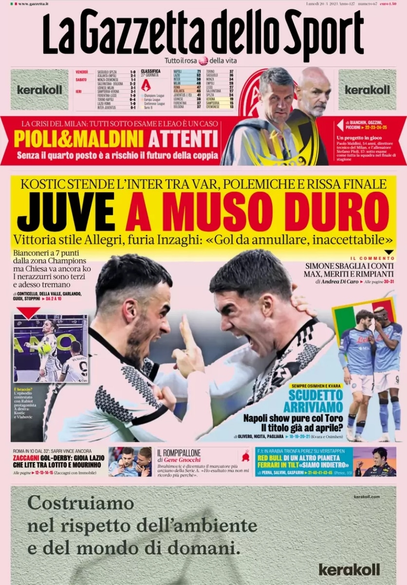 Grazie ai tre punti conquistati contro l’Inter la Juve sale a quota 41 punti in classifica e nonostante le penalizzazioni si ritrova a soltanto sette punti di distanza dalla zona Champions League.