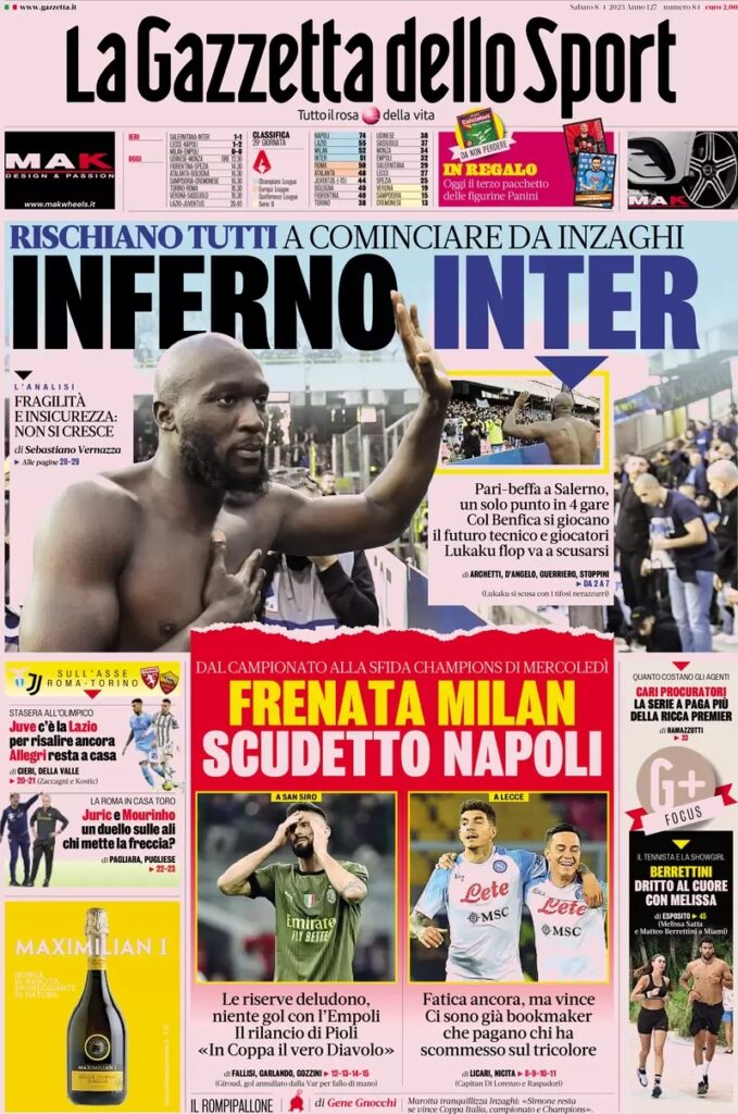 A far sperare i tifosi della Juve sono però le prestazioni di Inter e Milan, che anche ieri non sono riuscite a vincere. L’Inter ha infatti pareggiato contro la Salernitana mentre il Milan contro l’Empoli.