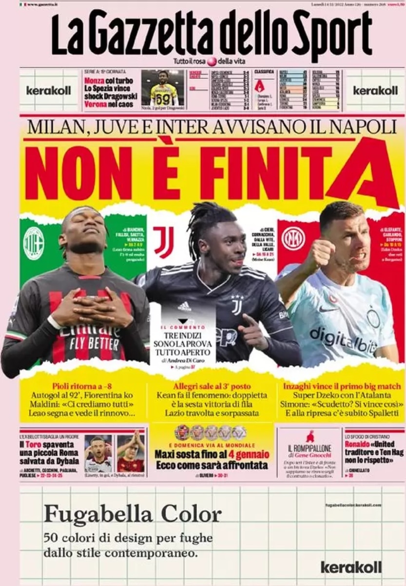 La squadra di Spalletti sembra viaggiare a un’altra velocità, ma i bianconeri nonostante il disastroso inizio di stagione sono comunque terzi. A gennaio con il pieno recupero di Pogba e Chiesa, Allegri potrà sperare nella rimonta.