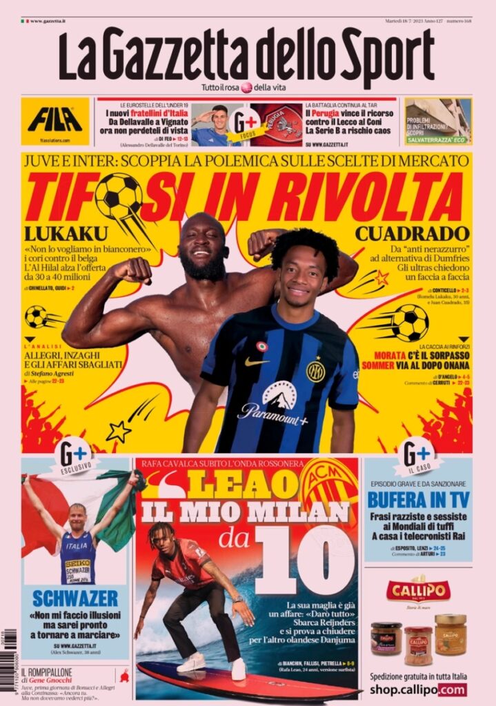 “Tifosi in rivolta. Juve e Inter: scoppia la polemica sulle scelte di mercato”, questo il titolo in prima pagina de La Gazzetta dello Sport. Lukaku alla Juve e Cuadrado all’Inter, due operazioni che fino a poche settimane fa sembravano impossibili e che ora potrebbero diventare realtà, ma che non fanno felici i tifosi. Proteste e manifestazioni contro le due società.