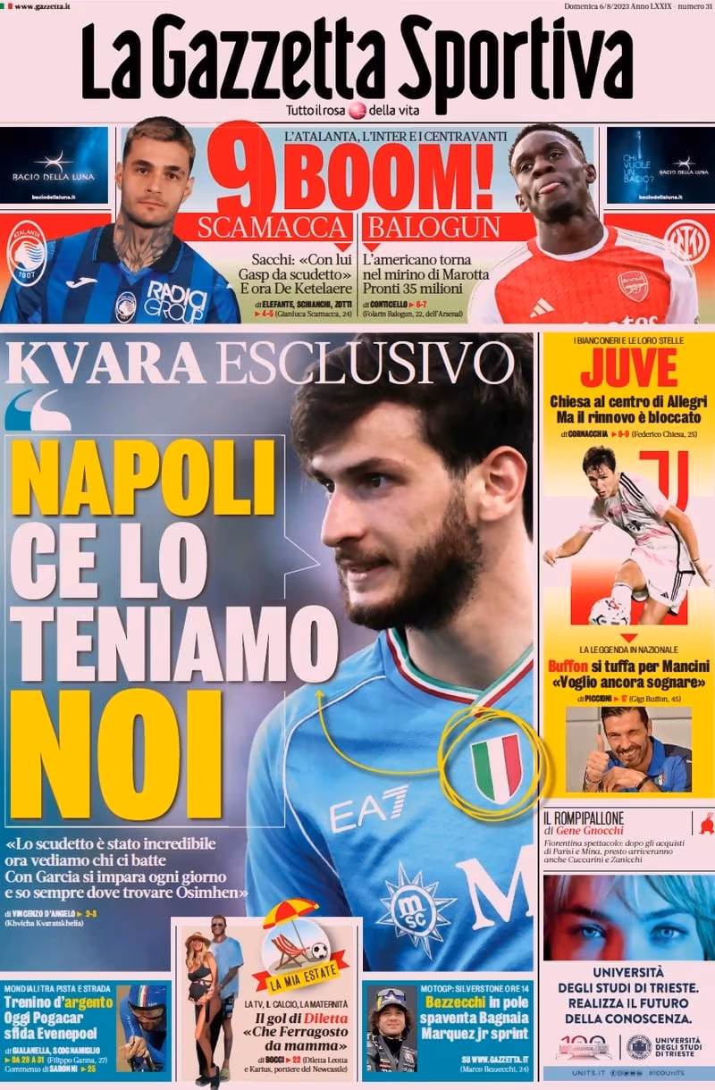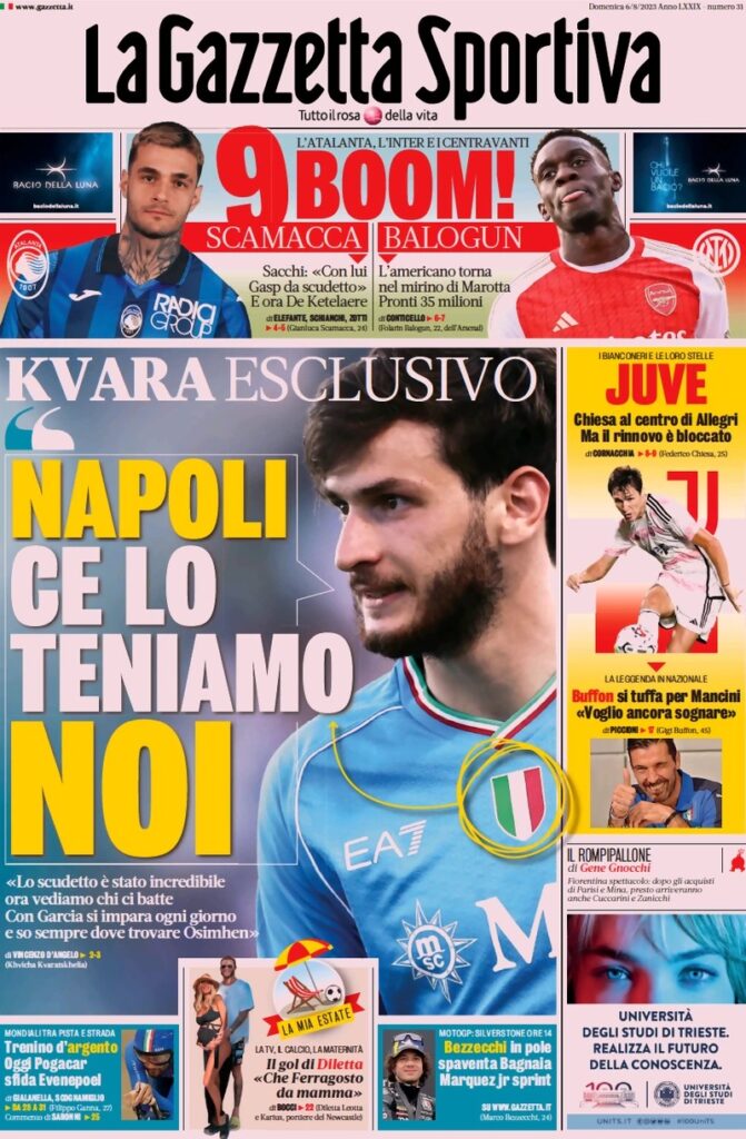 La Rosea stamattina si sofferma su un’altra stella bianconera: “Chiesa al centro di Allegri. Ma il rinnovo è bloccato” e poi: “Buffon si tuffa per Mancini ‘Voglio ancora sognare’ “.
