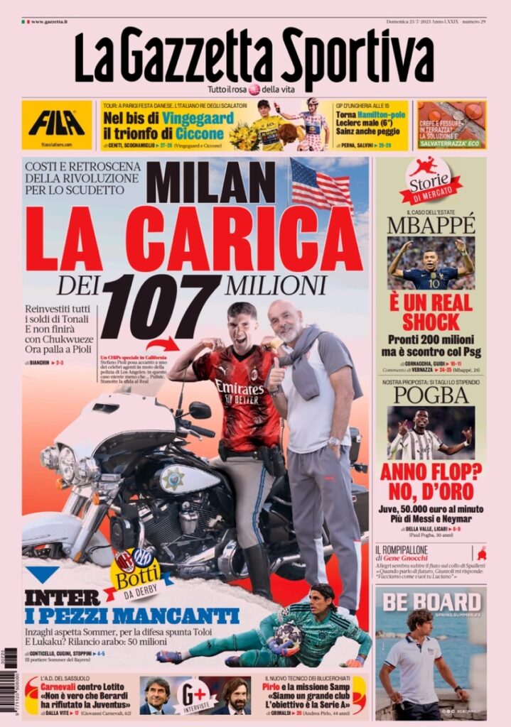 La Gazzetta dello Sport in edicola oggi in taglio laterale titola: “Pogba, anno flop? No, d’oro”. Il francese ha guadagnato 50000 euro per minuto giocato, più di Messi e Neymar. La proposta della Rosea è semplice: per rimanere il francese dovrebbe accettare un corposo taglio dello stipendio.
