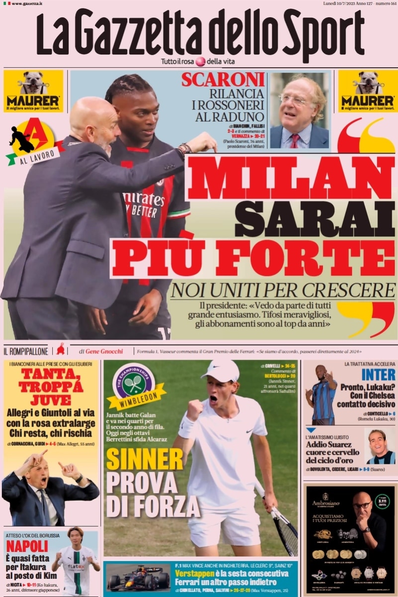 Il Corriere dello Sport apre in vece con la trattativa che dovrebbe portare Lukaku alla Juve: “La Juve addosso. La chiave è l’uscita di Vlahovic ma il Chelsea lo spinge all’Al-Hilal”.